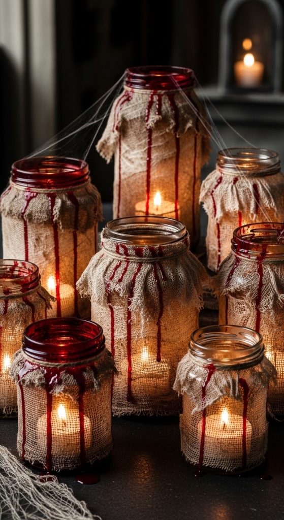 Turn ordinary candle holders into eerie Halloween centerpieces. Use old jars, wine bottles, or glass containers as bases. Wrap them in gauze or cheesecloth, then stain them lightly with coffee or tea for an aged look.
