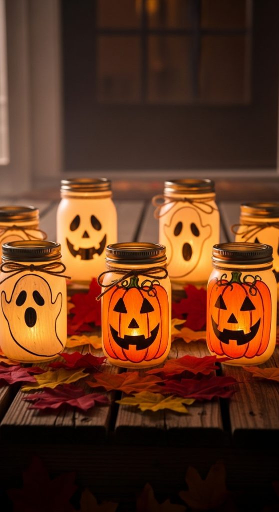 Mason jars are incredibly versatile for DIY projects, and during Halloween, they can be transformed into glowing lanterns that add a haunting ambiance. To make them, clean your jars thoroughly and paint the exteriors with acrylic paints in orange, black, or white. Use black paint or a marker to draw faces, spiders, bats, or ghosts.