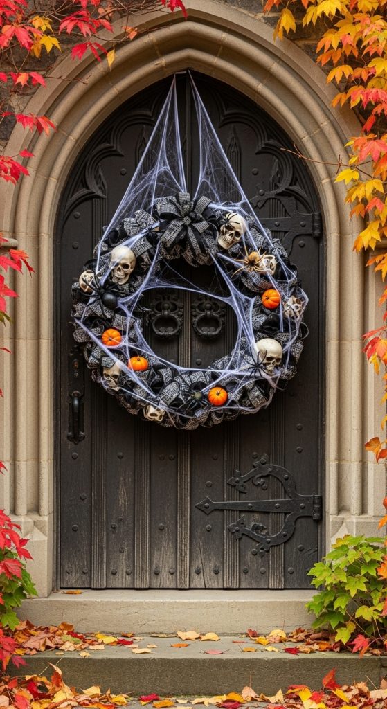 A Halloween wreath is a welcoming yet spooky decoration for your front door. You can make one using a wire or foam wreath base, black ribbon, faux cobwebs, and Halloween-themed ornaments. Wrap the base with black or orange ribbon until fully covered, then attach mini plastic spiders, skulls, or bats with hot glue.