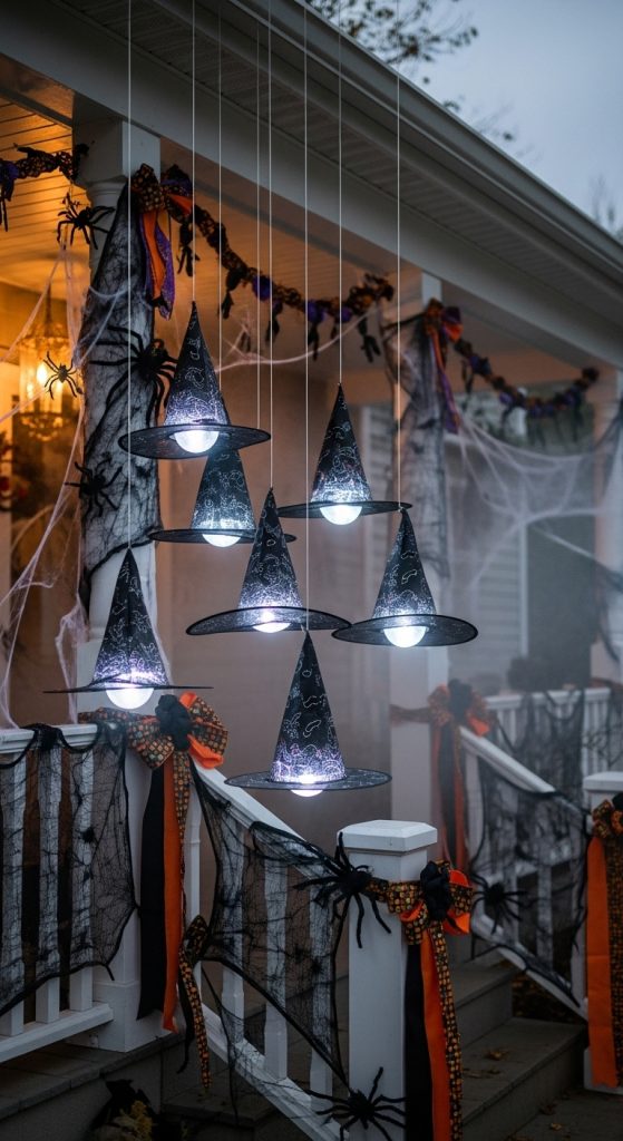 Hanging witch hats are a whimsical way to decorate your porch, hallway, or living room. Purchase lightweight witch hats from a craft store and attach fishing wire to the tops. Suspend them from the ceiling at varying heights to create an illusion of floating hats.