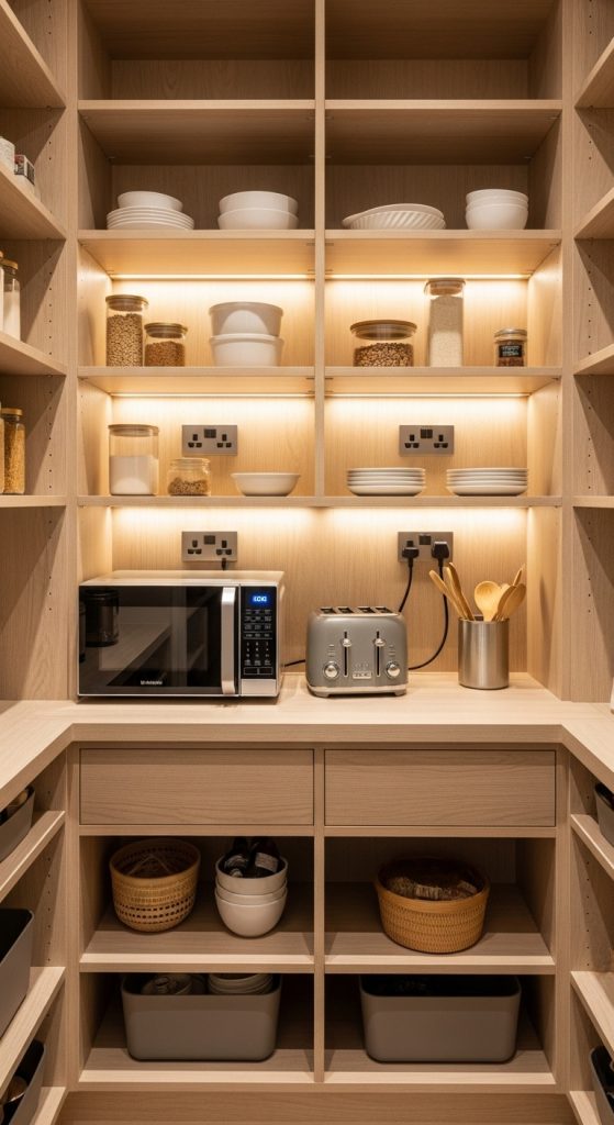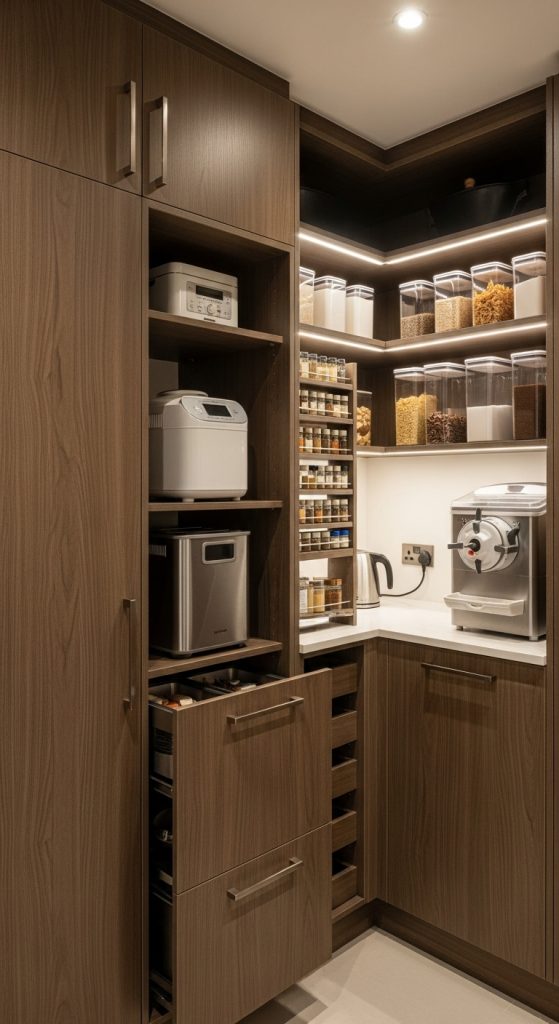 The addition of hidden outlets turns the pantry into a secondary workspace, making it more than just a storage area.