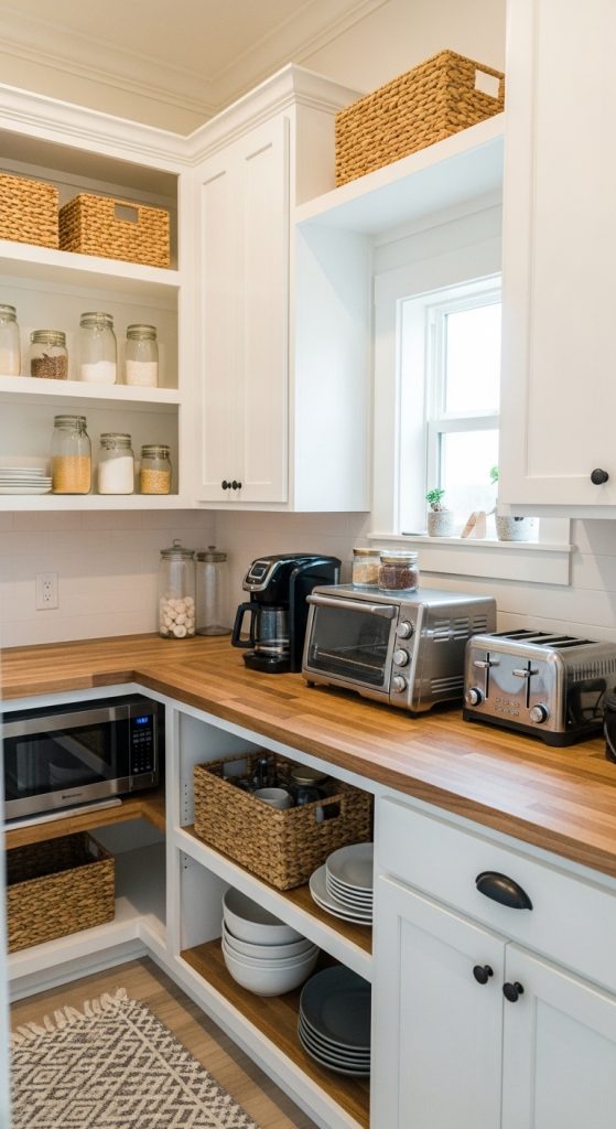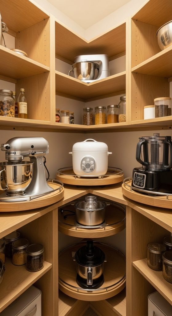 Corner spaces in pantries are often underutilized, but they can be excellent for appliance storage. Installing a lazy Susan or rotating shelf system in a corner pantry allows easy access to heavy or bulky appliances.