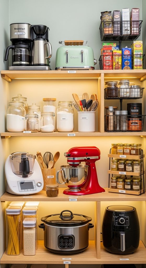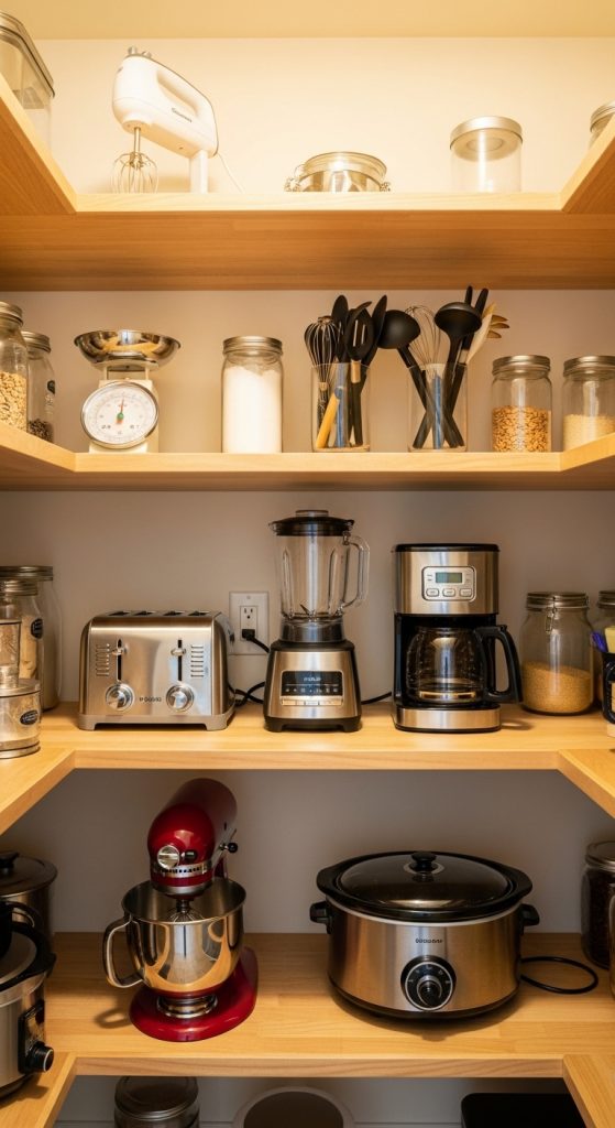 Grouping by use makes it easier to locate the right appliance quickly and ensures logical placement within the pantry.