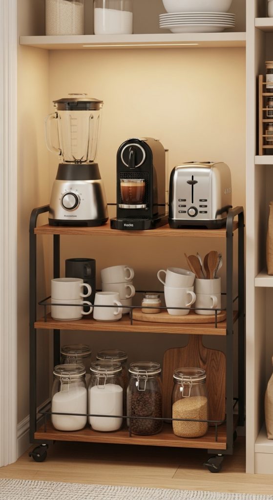 A rolling cart that fits inside the pantry provides flexible storage for appliances. You can load it with frequently used appliances such as a coffee maker, blender, or toaster, along with related accessories like mugs or utensils.