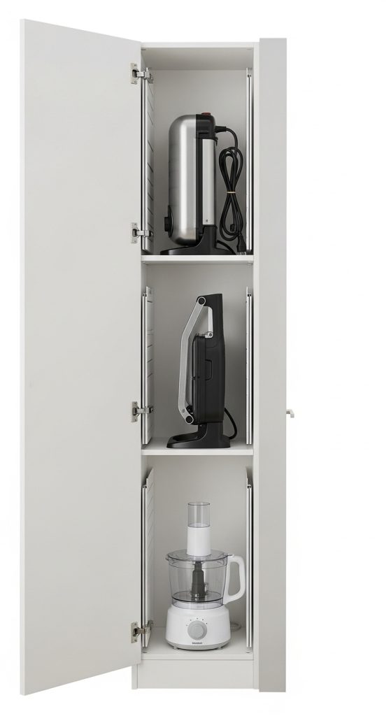 With adjustable shelves, you can make taller spaces for mixers or coffee machines and narrower spaces for compact gadgets. This level of flexibility ensures that every appliance fits neatly, no matter its dimensions.