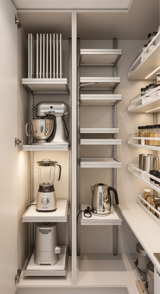 Adjustable shelving is particularly useful if your appliance collection changes over time, as it allows the pantry to evolve with your needs.