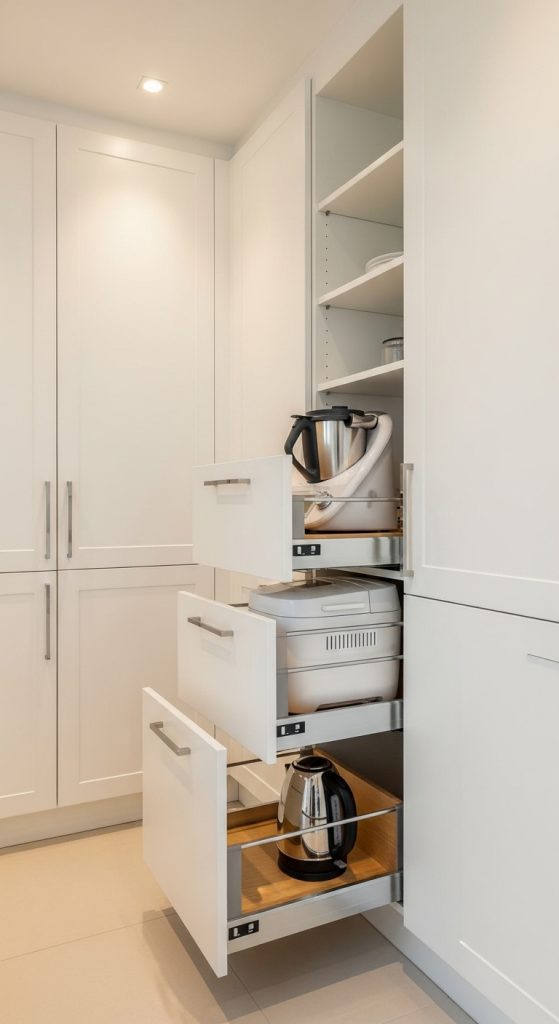Deep pull-out drawers are perfect for storing medium to large appliances such as food processors, bread machines, or pressure cookers. Shallow drawers can hold smaller gadgets like handheld mixers, electric kettles, or sandwich makers.
