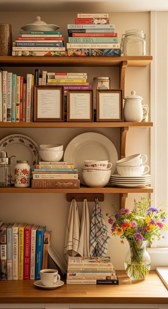These subtle additions make your kitchen shelves feel warm and inviting. They transform the space from purely functional to personal and expressive.