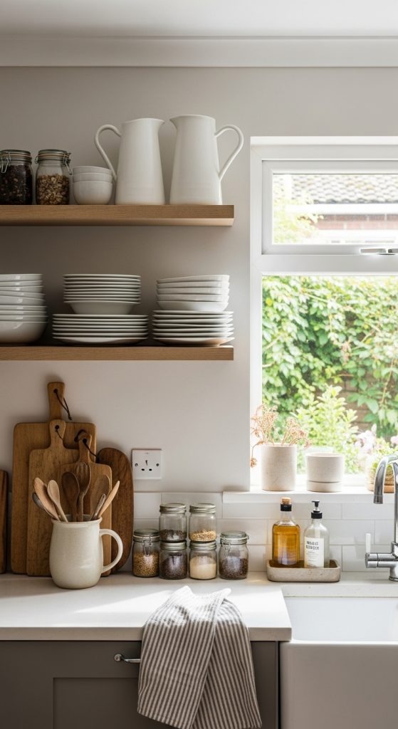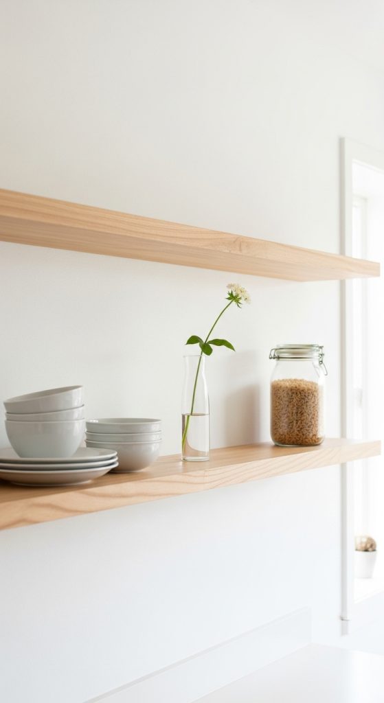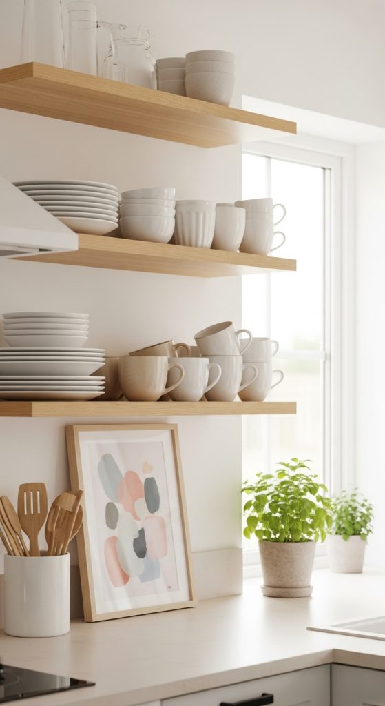 Mixing utility with beauty makes your shelves feel lived-in and natural. For instance, stack white dishes on one shelf and balance them with a small potted herb or a candle on the next. The contrast between practical items and decorative accents creates visual harmony.