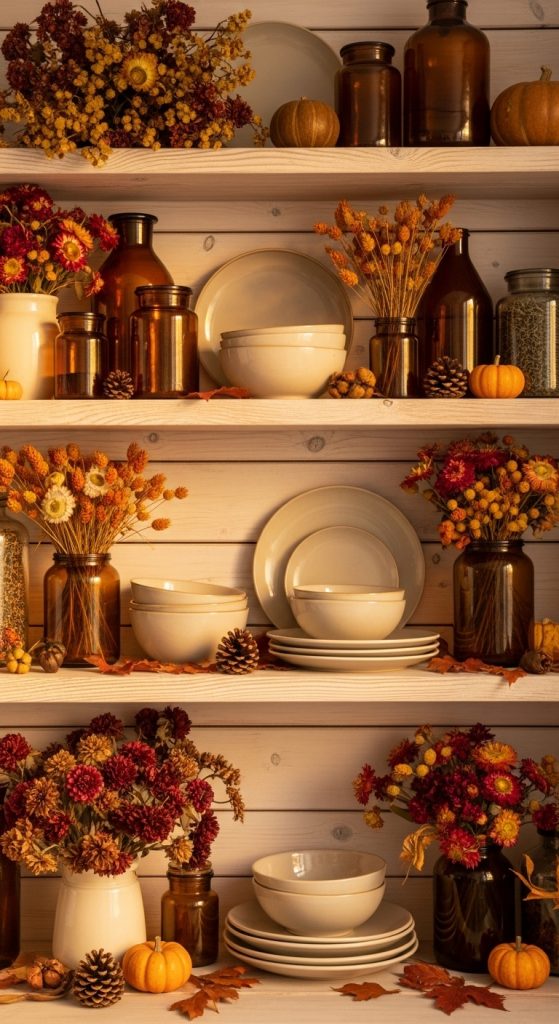 Keep your shelves fresh and interesting by updating them seasonally. During summer, display fresh lemons, glass jars, and light linens. In autumn, switch to warm wood tones, pumpkins, and dried flowers.