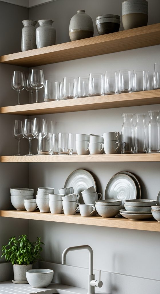 Showcasing your favorite glassware and ceramics adds personality to your kitchen. Transparent glasses catch light beautifully, while ceramics add a handmade, artisanal feel.