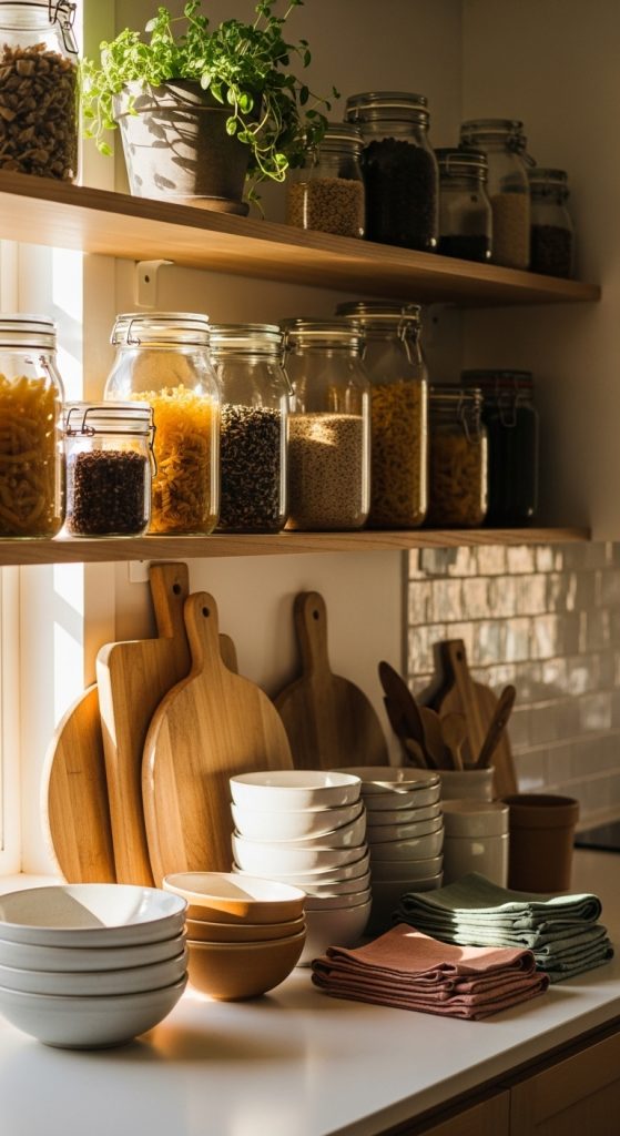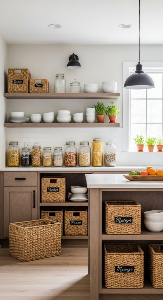 Woven or rattan baskets introduce warmth and texture, while clear glass jars are perfect for dry goods like pasta or coffee beans. Group similar items together to maintain visual order.