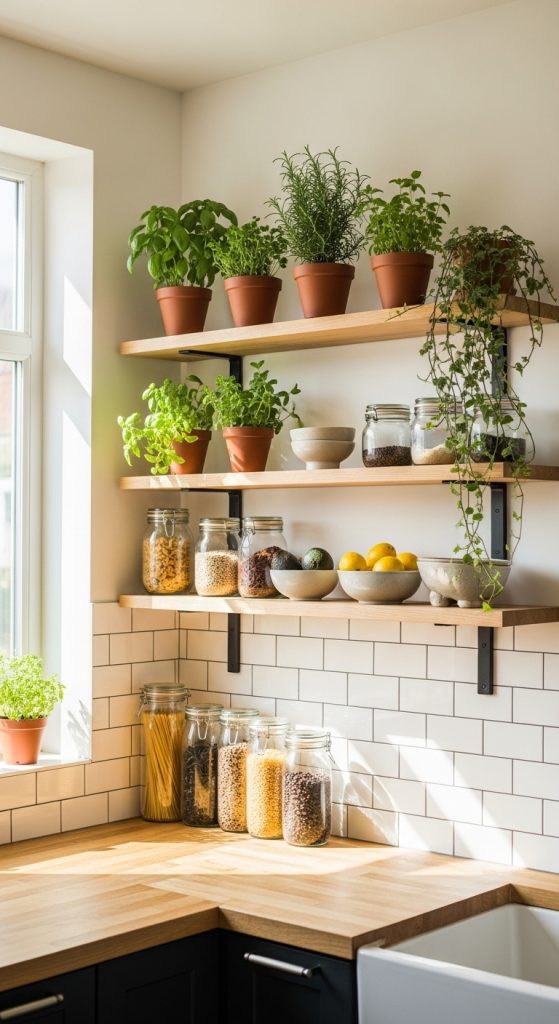 A touch of nature can instantly freshen up your kitchen. Add potted herbs, trailing plants, or small vases of fresh flowers to your shelves. The greenery brings color, texture, and life to the space.