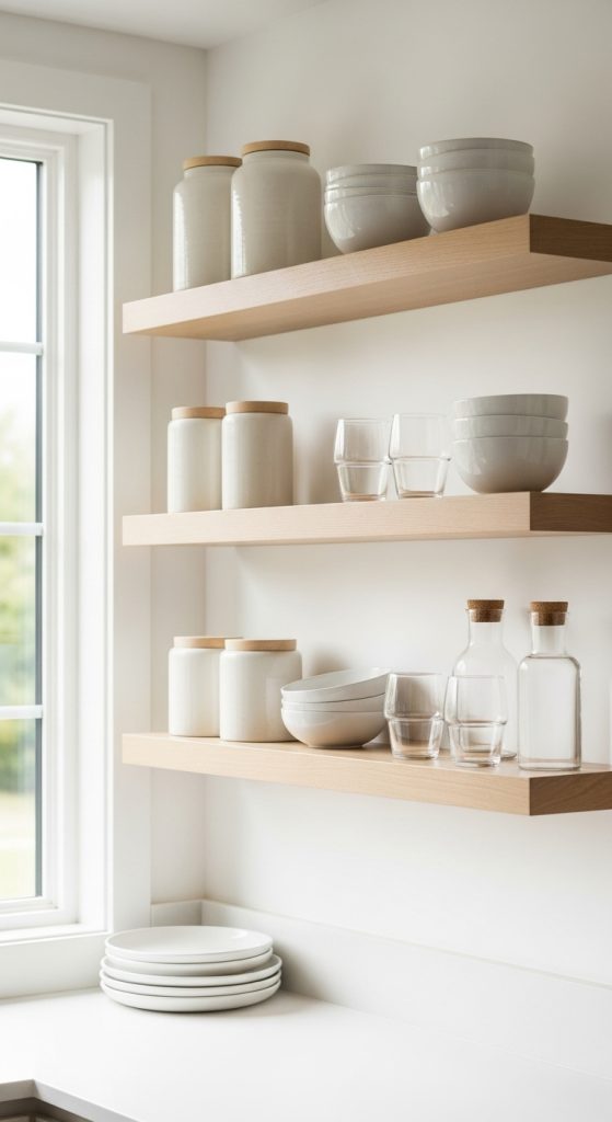 A cohesive color scheme prevents your shelves from feeling cluttered or chaotic. It also allows each piece — whether it’s a ceramic bowl or a glass jar — to stand out in a subtle, elegant way.