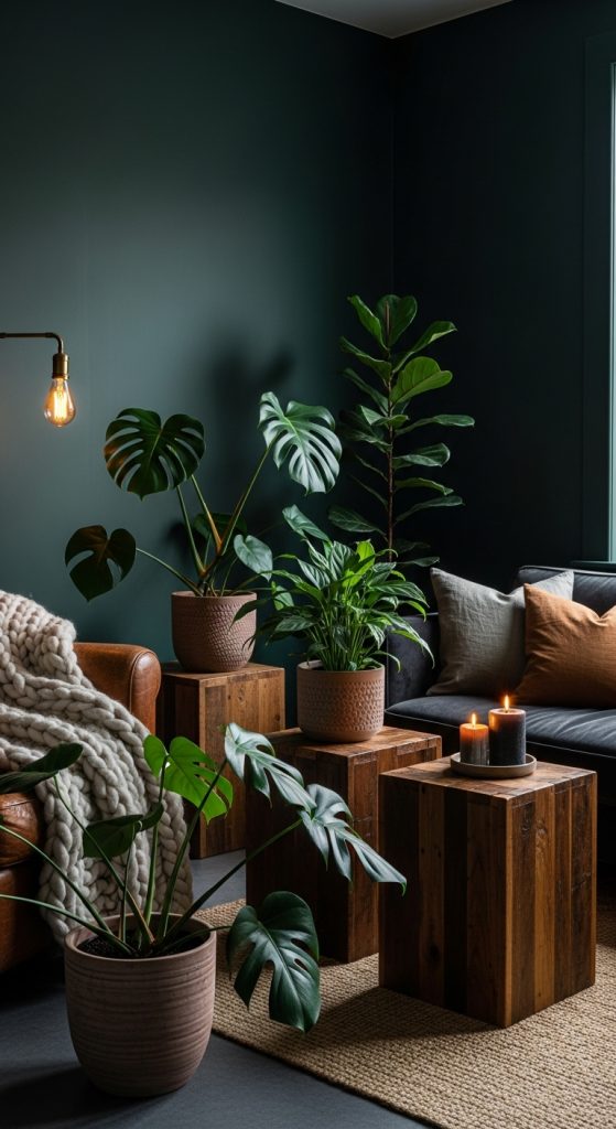 In moody interiors, plants act as a gentle contrast to darker tones. Place them in terracotta or matte ceramic pots to enhance the earthy aesthetic. Even a single large plant in a corner can break up the darkness and soften the space.