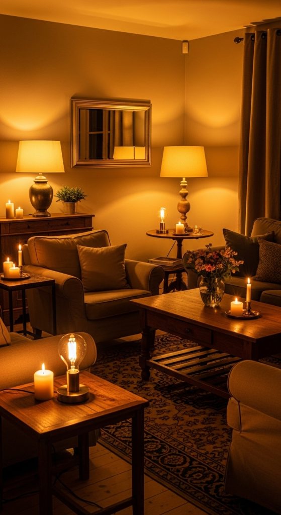 Lighting is one of the most powerful tools for setting a moody cozy mood. Instead of relying on a single overhead light, use multiple light sources placed strategically around the room. Table lamps, wall sconces, and floor lamps with warm-toned bulbs create pools of soft light.