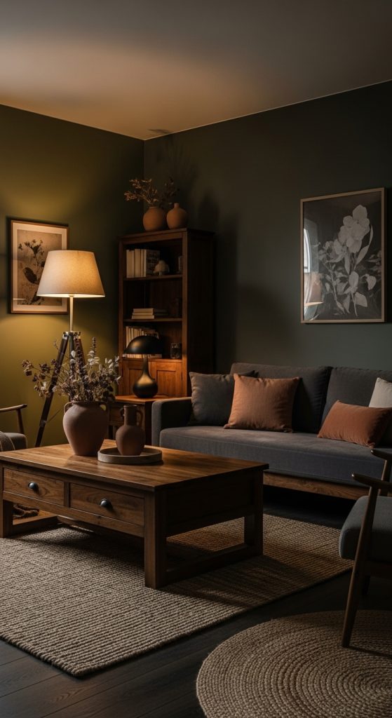 You do not need to paint every wall in a dark color. Even a single accent wall in a deep hue can create a dramatic backdrop. Pairing these tones with softer shades like beige, cream, or muted terracotta helps keep the room balanced. The result is a space that feels enveloping and cocoon-like, perfect for cozy evenings.
