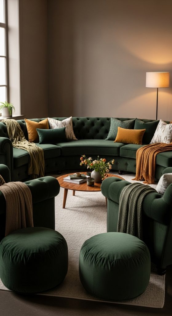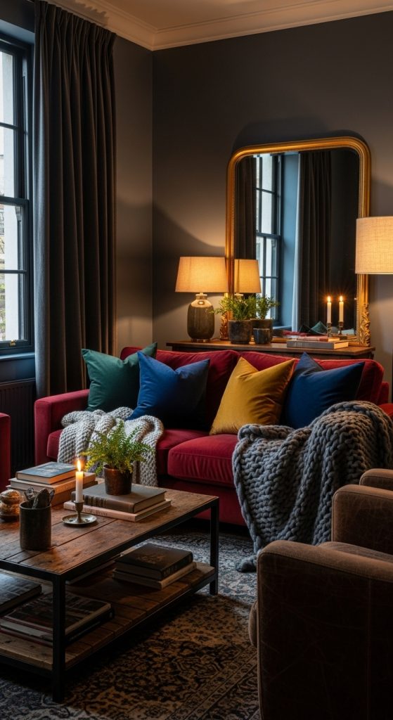 Comfort is essential in a cozy living room, and seating should invite relaxation. Deep sofas in velvet or chenille, oversized armchairs, and poufs create an environment that feels indulgent. Opt for earthy or jewel-toned upholstery to tie into the moody palette.