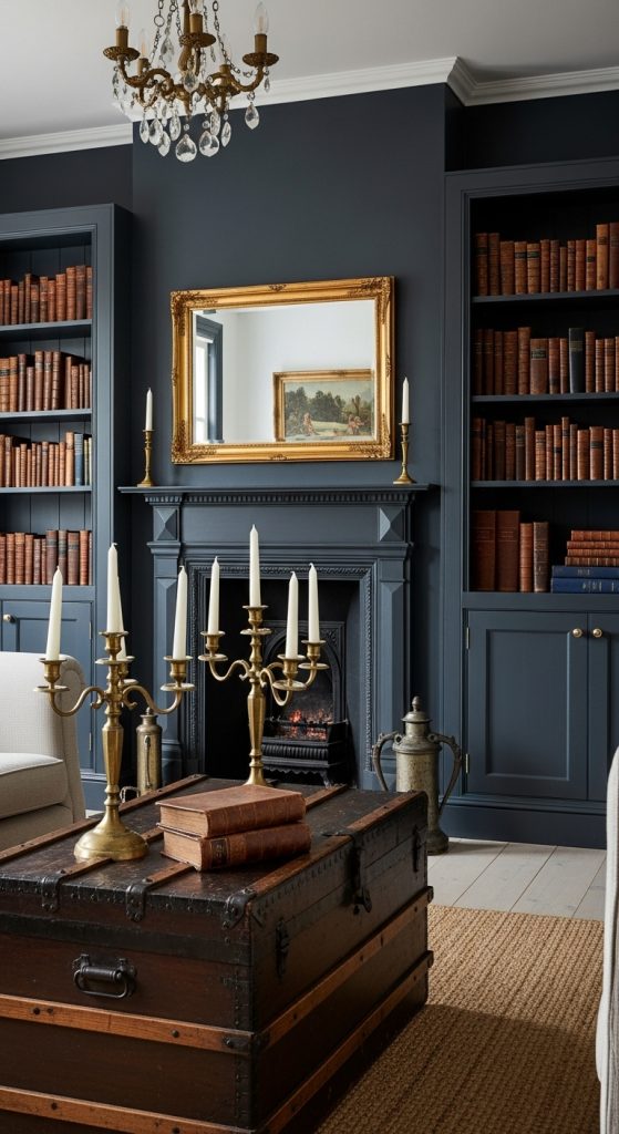 Vintage and antique decor items bring character and history into a moody cozy living room. Look for wooden chests, brass candlesticks, or aged leather-bound books to display on shelves or coffee tables. These elements create a lived-in, layered atmosphere that feels authentic.