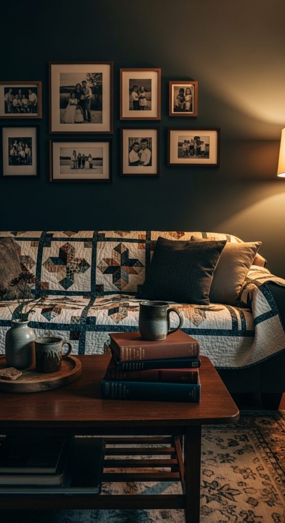 The final layer of a moody cozy living room is personalization. Display items that tell your story, such as framed photographs, meaningful artwork, or heirloom decor. Stack favorite books on coffee tables, add handmade pottery to shelves, or drape a quilt across the sofa.
