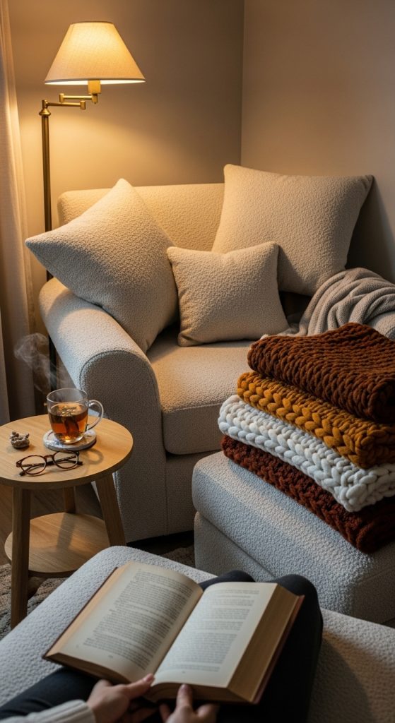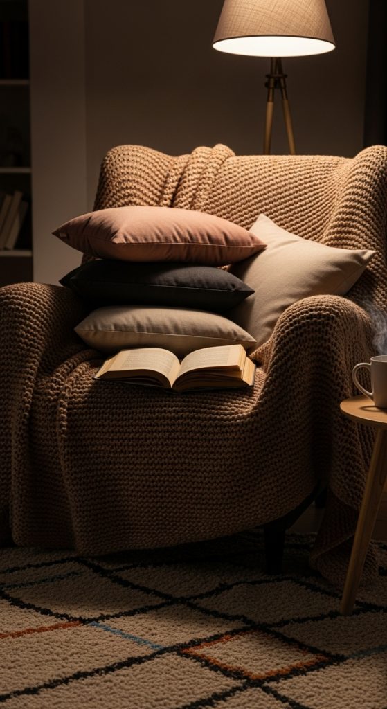 Comfort is key for a cozy reading night, and textiles play a big role in this. Layer your chair, bed, or sofa with plush throws, chunky knit blankets, and soft cushions. Choose natural fabrics such as cotton, linen, or wool to make the space more breathable and inviting.