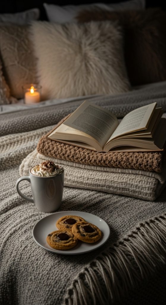 Nothing completes a cozy night of reading like a warm drink or a small snack. Keep a side table near your chair or bed for a mug of tea, hot chocolate, or coffee. Add a small tray with biscuits, fruit, or other light snacks.