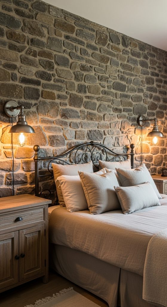 If you have the option, a stone accent wall behind the bed creates a striking centerpiece. Even smaller touchesโlike a stone lamp base, pebble decor, or a stone-look wallpaperโcan make a difference.