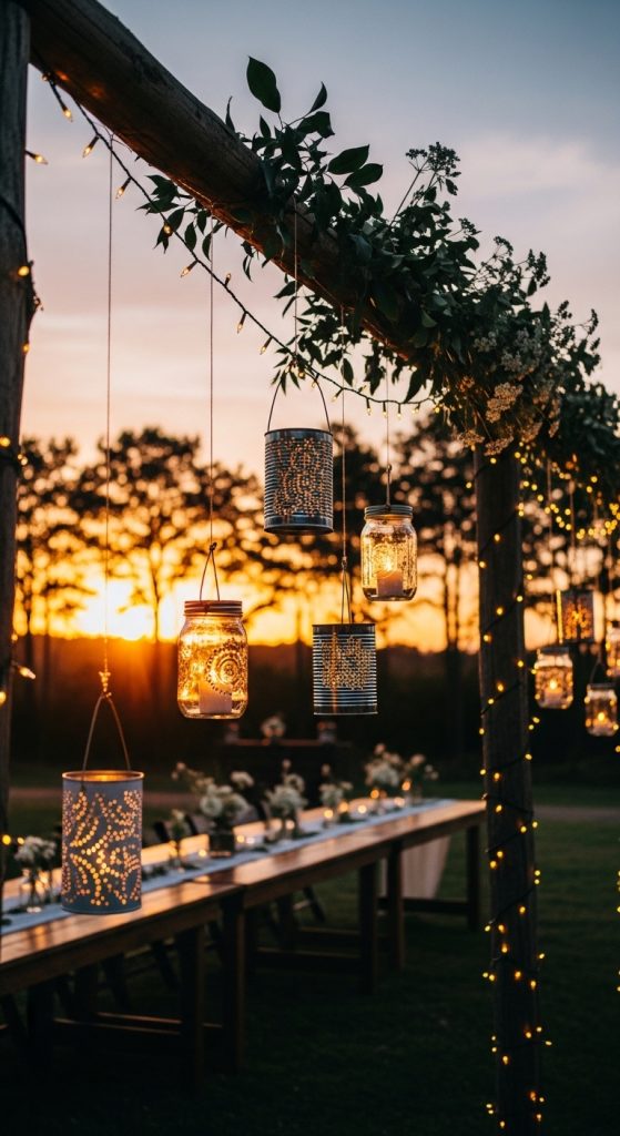 Lighting sets the tone of a wedding, and rustic style thrives on warm, intimate light. Instead of renting expensive lighting fixtures, create your own lanterns or candle arrangements. Old jars, recycled tin cans with holes punched for patterns, or thrifted lanterns can be repurposed into glowing decor.