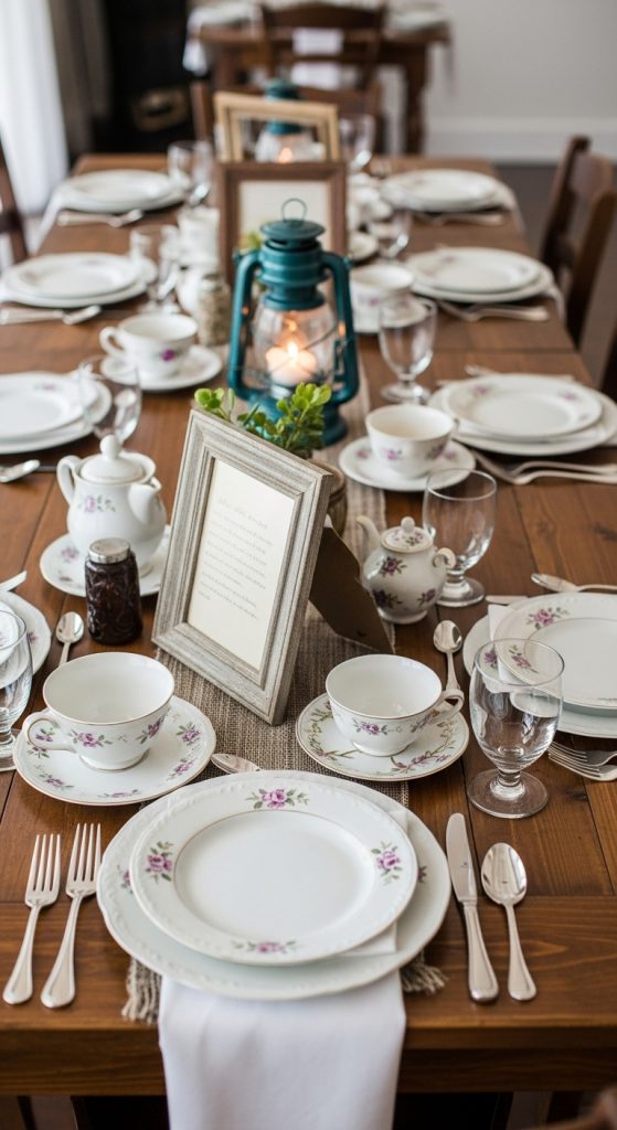Vintage-inspired table settings with mismatched plates or silverware create a charming, lived-in feel. Even old ladders or windows can be repurposed into decor, such as a display stand for seating charts or a backdrop for photos. These secondhand finds embody the rustic principle of reusing and repurposing while keeping costs minimal.