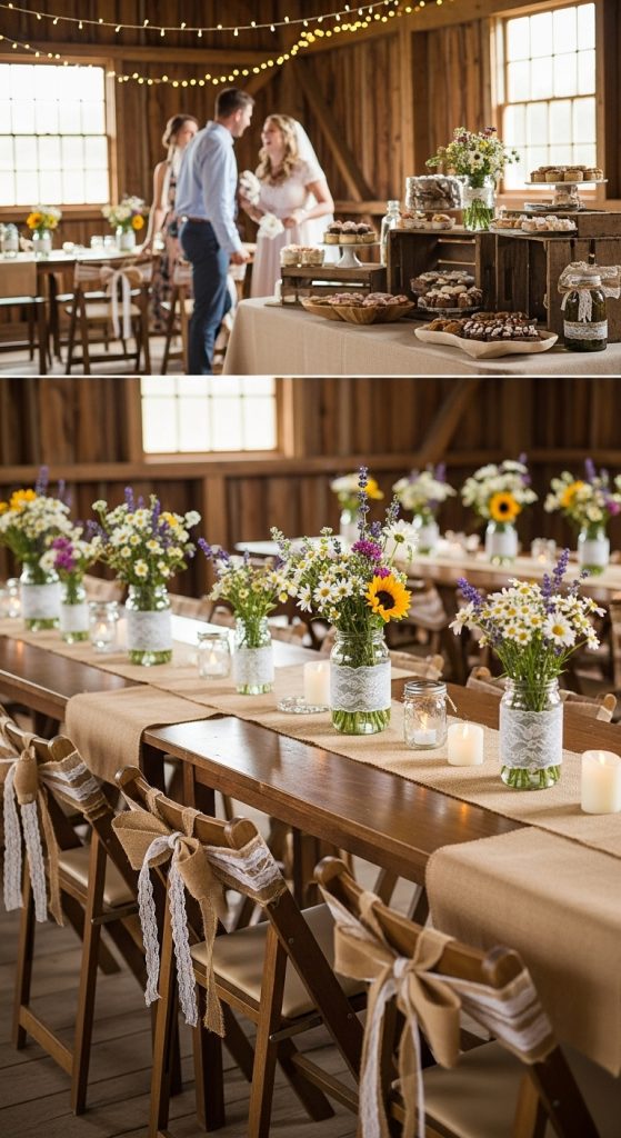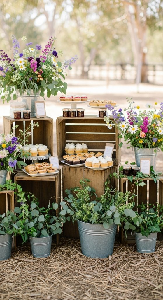 For favors, consider budget-friendly items presented in rustic packaging. Jars of homemade jam, small bags of coffee beans, or seed packets wrapped in kraft paper and tied with twine make thoughtful gifts. Displaying them in wooden crates or woven baskets ties the look together while keeping costs low.