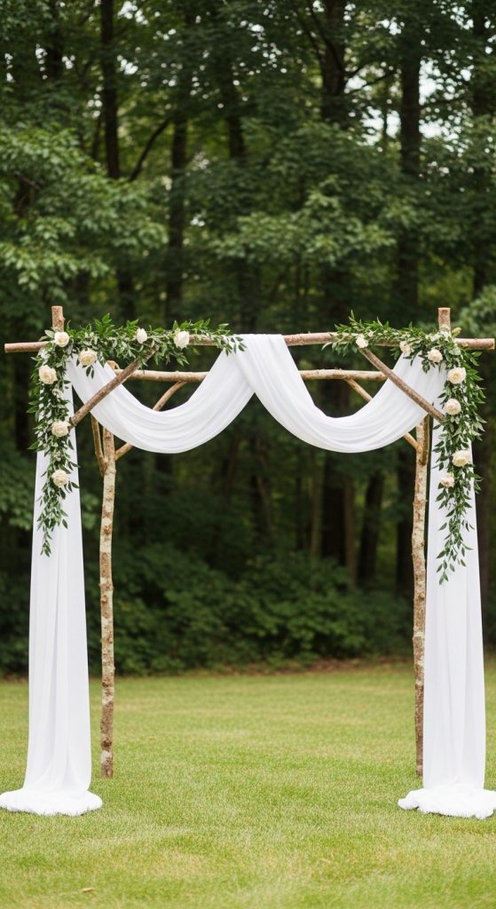 A rustic ceremony arch is often the centerpiece of the wedding ceremony, but it does not have to be elaborate or expensive. Simple wooden frames, tree branches, or even repurposed doors can form the structure. Draping the arch with fabric, greenery, or seasonal flowers completes the look at a fraction of the cost of renting a professional arch.