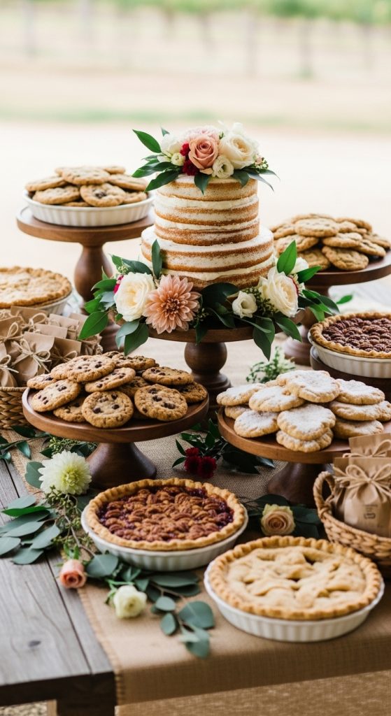 Dessert and favor displays can be a highlight of the reception and do not need to be expensive. A wooden table with homemade desserts such as pies, cookies, or a naked cake decorated with fresh flowers embodies rustic charm without high catering costs.