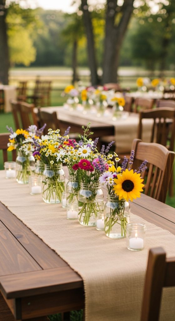 Mason jars are synonymous with rustic weddings and one of the most affordable and versatile decor pieces. They can be used as vases for flowers, as candle holders, or even as drinking glasses for signature cocktails. Buying them in bulk or reusing jars collected over time keeps costs low.