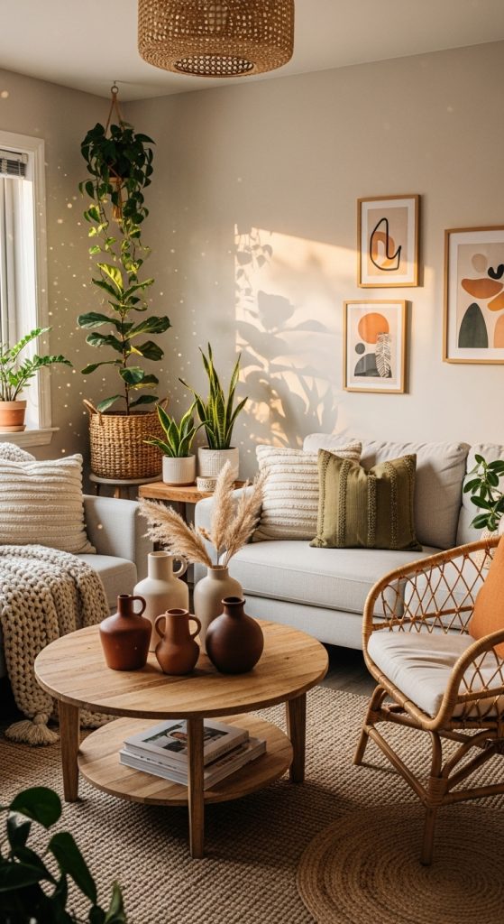 Wooden accents such as coffee tables, shelving, or picture frames can also infuse natural warmth into your decor. Incorporating stone or ceramic pieces, such as vases or candle holders, enhances the organic aesthetic.