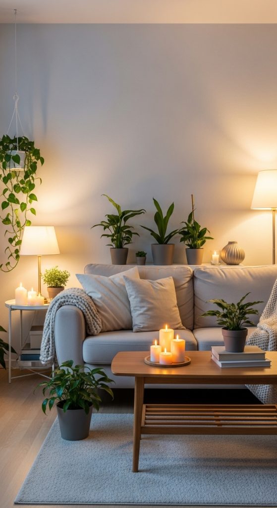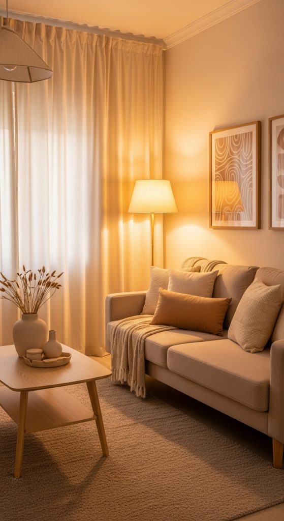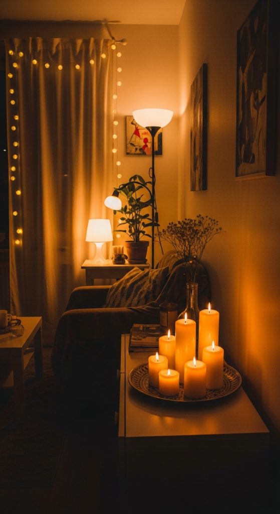 Lighting plays a key role in creating a cozy aesthetic. Overhead lighting often feels harsh, especially in small apartments. Instead, aim for a layered lighting approach with table lamps, floor lamps, and string lights.