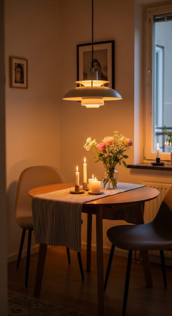 Add a textured table runner, warm toned dinnerware, and a pendant light with a soft glow above the table to create an inviting atmosphere. Placing candles or a small vase of fresh flowers on the table adds charm without taking up much space.