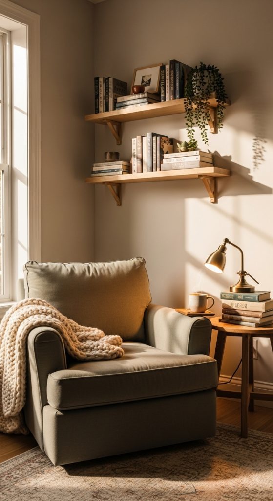 Layer the chair with a plush cushion and blanket, and place a floor lamp nearby to create perfect reading light. Adding a small bookshelf or floating shelves above the nook can enhance the cozy atmosphere while providing storage.