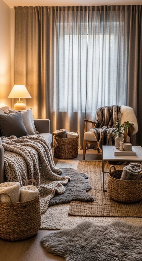 Cozy interiors thrive on texture. In a small apartment, you can elevate comfort by layering fabrics and materials. Consider plush throw blankets, chunky knit pillows, woven rugs, and linen curtains. Adding natural materials like wood, rattan, and wool balances softness with earthy grounding elements.