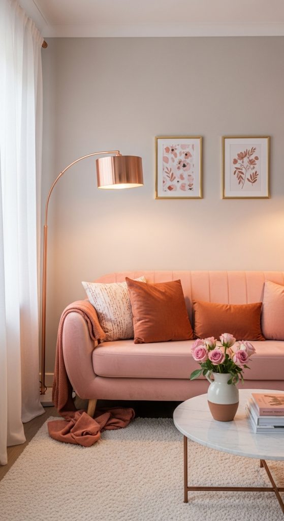 Blush pink sofas or curtains combined with terracotta cushions, rugs, or walls create a harmonious and layered look. Metallic accents like rose gold lamps or frames can elevate the sophistication of this palette, adding a subtle luxury feel.