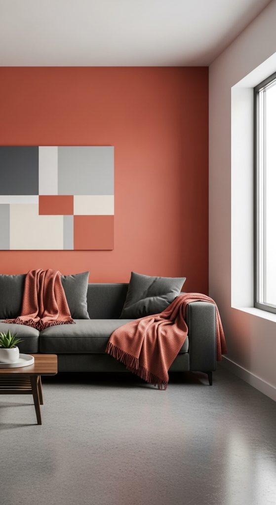 Charcoal gray sofas, chairs, or rugs combined with terracotta cushions, throws, or accent walls provide a sleek and modern look. Minimalist decor with geometric designs enhances the contemporary vibe of this palette.