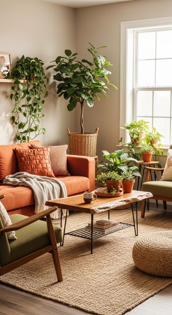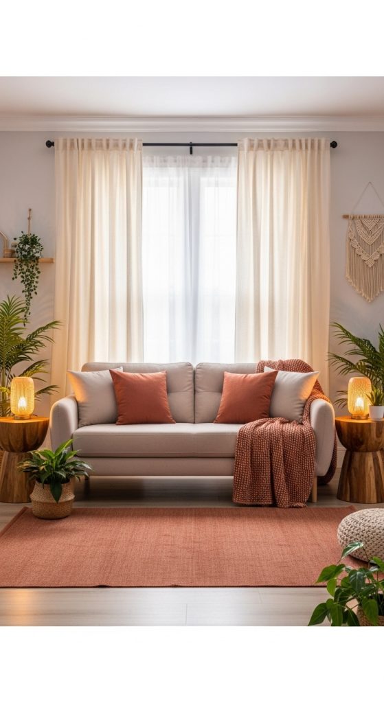 Adding woven rugs, jute baskets, and natural fabrics such as linen or cotton enhances the rustic and earthy aesthetic. This combination is perfect for those who want a living room that feels inviting, comfortable, and connected to nature.