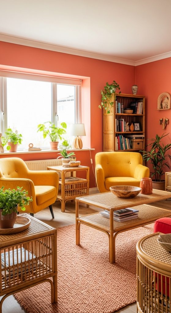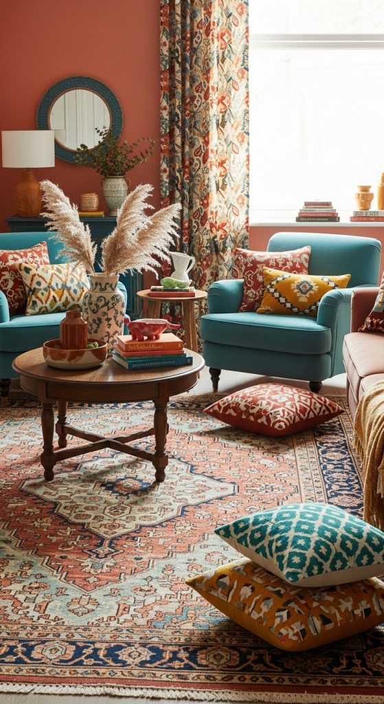 Teal sofas or armchairs paired with terracotta walls, cushions, or rugs create a dynamic visual appeal. Patterned textiles and eclectic accessories complete the look, making the living room stylish, lively, and fun.