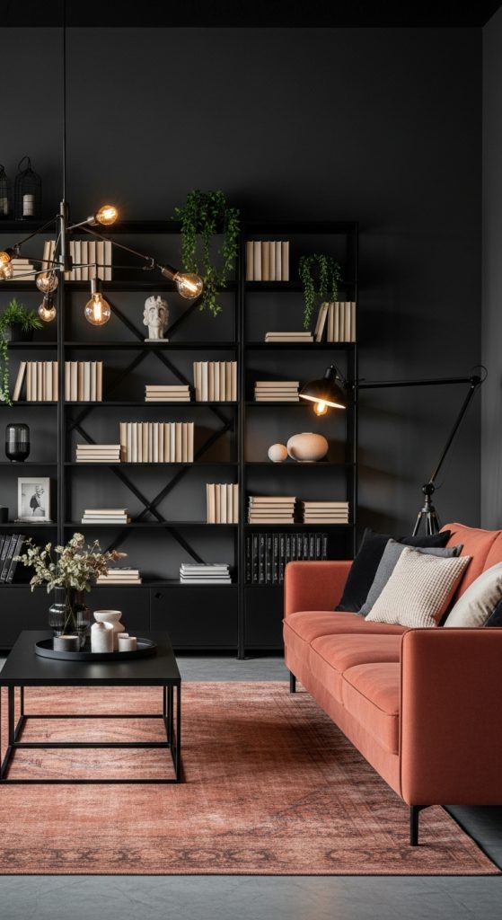 A black coffee table, black-framed art, or black shelving paired with terracotta walls or a sofa creates a striking and elegant balance. This combination works particularly well in modern, industrial, or urban interiors where dramatic contrasts are desired.