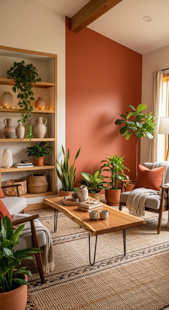 Terracotta paired with natural wood emphasizes rustic charm and organic warmth. Wooden furniture like coffee tables, shelving, or beams paired with terracotta walls, cushions, or rugs creates a grounded and cozy environment.