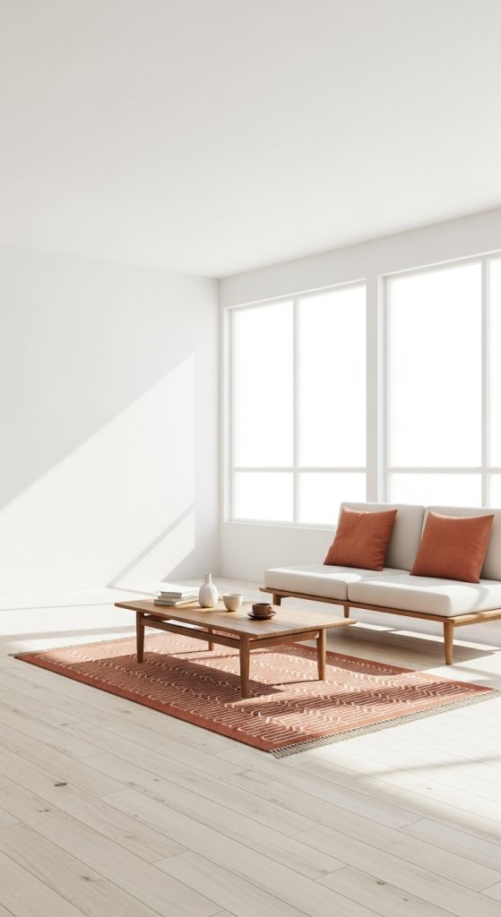 This palette works particularly well in smaller living rooms as the white elements keep the room feeling open while terracotta introduces a welcoming touch. Minimalist furnishings in natural materials such as wood enhance the simplicity and elegance of the design.