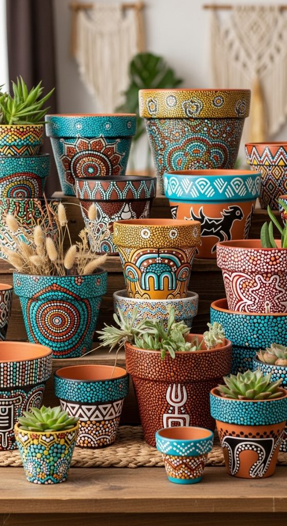 Boho painted pots pair beautifully with trailing plants like pothos or ivy. They bring vibrancy and personality to balconies, patios, or indoor corners. Combining multiple boho-styled pots in different designs creates an eclectic, artistic display.