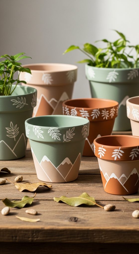 Sometimes the most beautiful designs are inspired by nature. Painting terracotta pots in earthy tones such as sage green, sandy beige, clay brown, or muted orange creates a soothing, organic feel. You can also add subtle patterns like leaves, waves, or mountains to enhance the natural vibe.