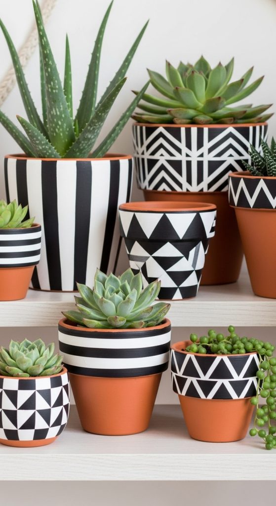 If you love modern and playful designs, painting terracotta pots with bold geometric patterns is a perfect choice. Use painterโs tape to create clean shapes such as triangles, stripes, or chevrons. Choose contrasting colors like black and white, navy and gold, or terracotta orange with teal for a striking effect.