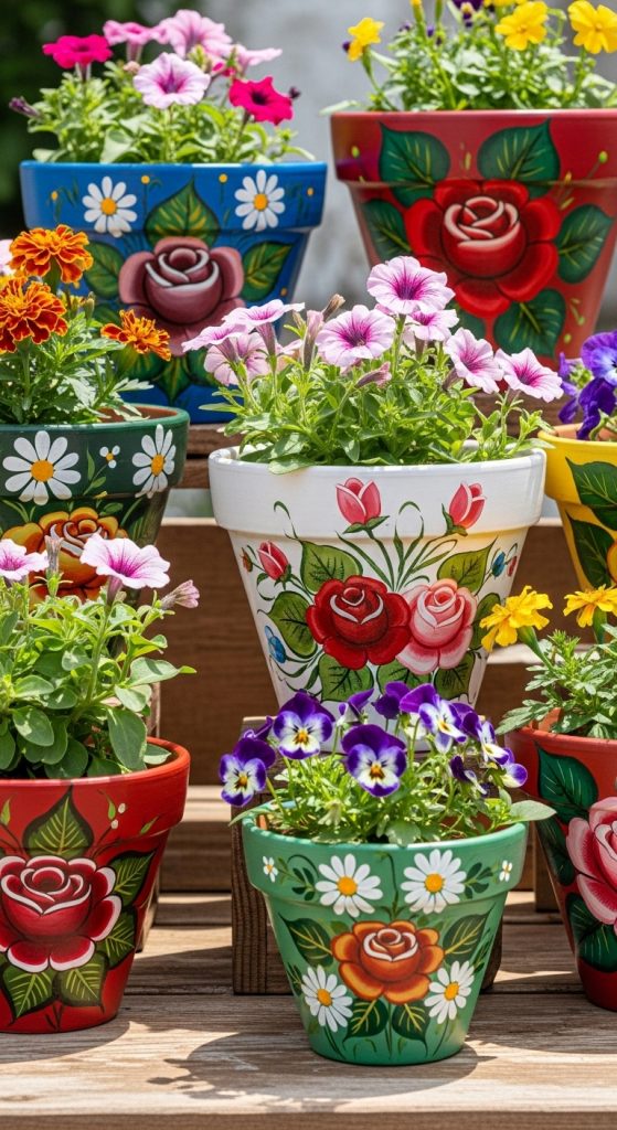 These pots make lovely gifts or personalized decor pieces for patios, kitchens, or living rooms. They add a handcrafted, artistic touch that feels special and unique. A group of floral-painted pots in different sizes creates a garden-like display indoors.