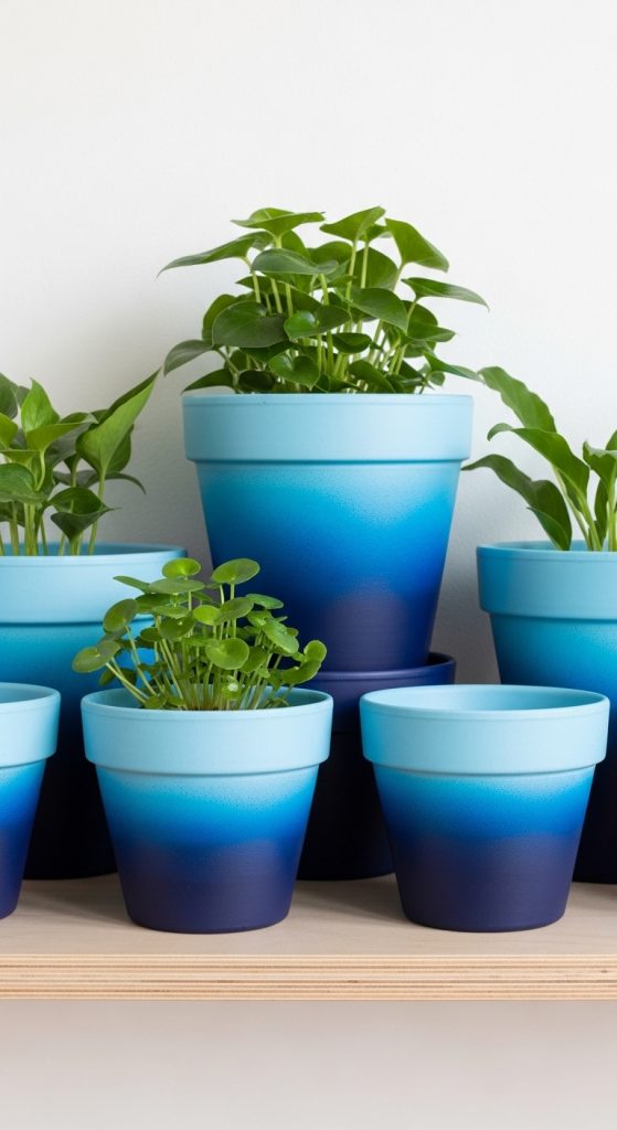 Ombre terracotta pots add a modern artistic touch to any room or garden. They are especially beautiful when paired with simple green plants that allow the gradient effect to shine. This technique works well on both small and large pots, offering endless creative possibilities.